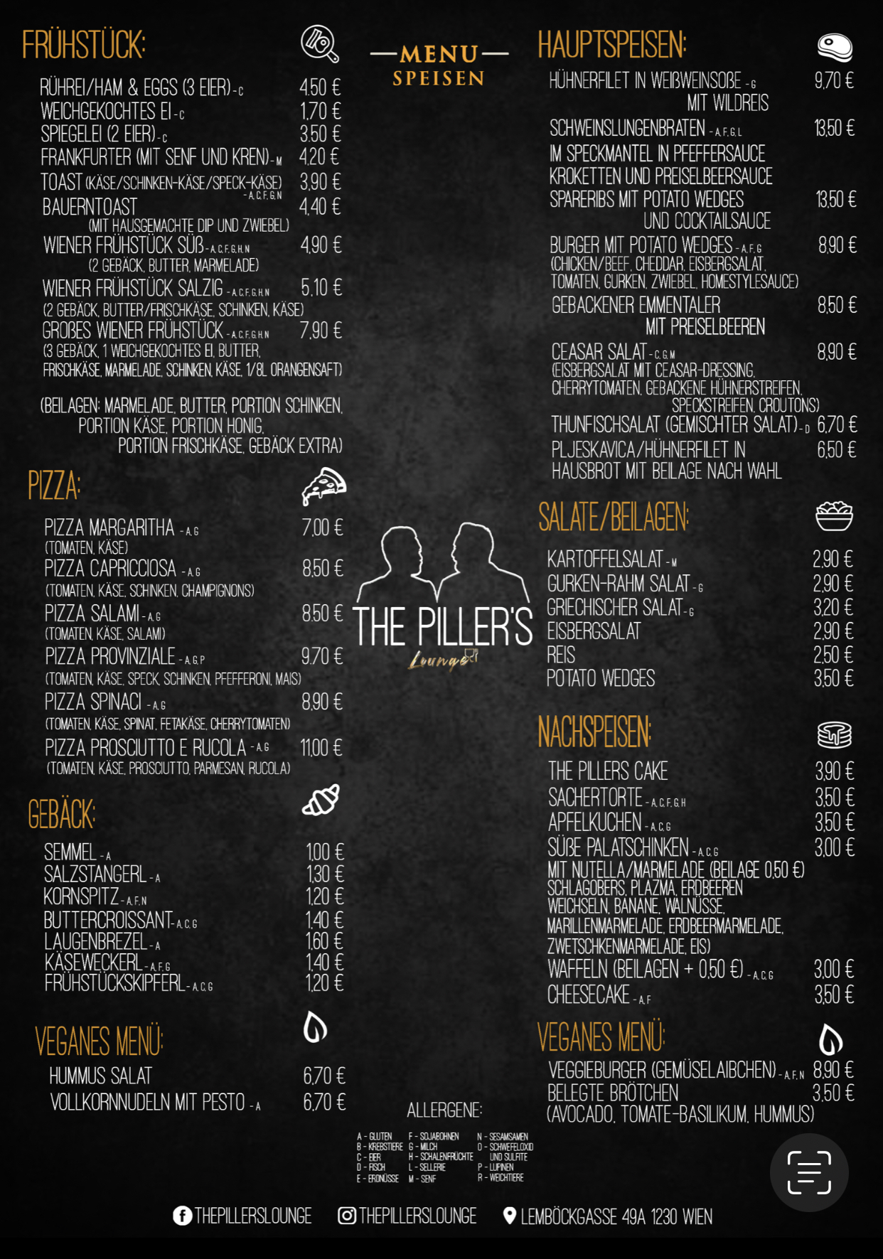 "The Piller's Lounge" bietet Ihnen verschiedenste hausgemachten Hauptspeisen und Desserts. Ebenfalls gibt es bei uns jeden Tag ein frisch gekochtes Mittagsmenü in der Zeit von 12:00 - 15:00 Uhr. Ihre Getränke und Speisen können Sie an Schönwetter in unserem Schanigarten oder unserer Lounge genießen. Wir freuen uns sehr, Sie bei uns bedienen zu dürfen!